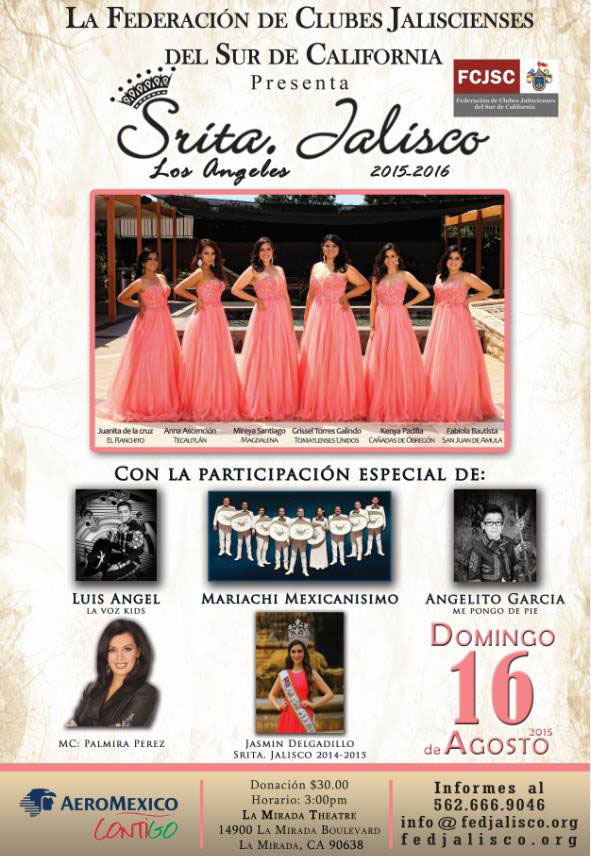 La Federación de Clubes jaliscienses del Sur de California les invita al Certamen Señorita Jalisco Los Ángeles 2015, acompáñanos a disfrutar y vivir nuestras tradiciones Jaliscienses, la cita es el Domingo 16 de Agosto en el teatro de La Mirada Ca. A las 3:00 PM, boletos ya a la venta.