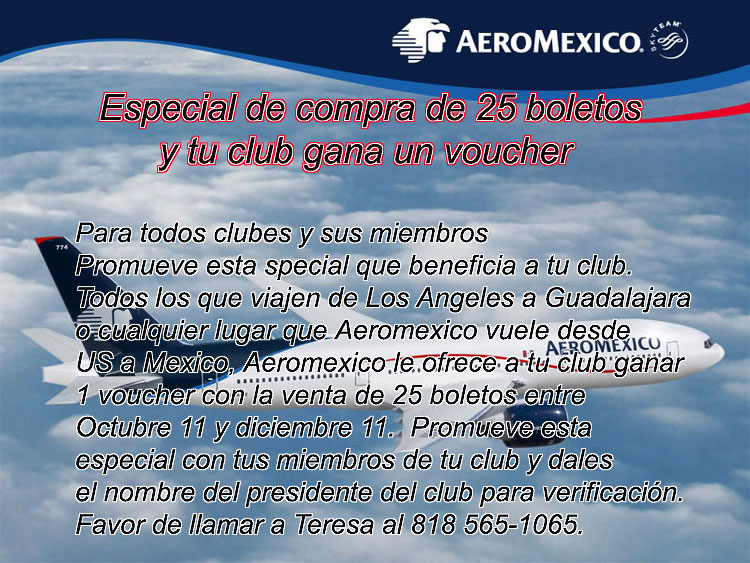 Promueve esta special que beneficia a tu club.Todos los que viajen de Los Angeles a Guadalajarao cualquier lugar que Aeromexico vuele desde US a Mexico, Aeromexico le ofrece a tu club ganar 1 voucher con la venta de 25 boletos entre Octubre 11 y diciembre 11. Promueve esta especial con tus miembros de tu club y dales el nombre del presidente del club para verificación. Favor de llamar a Teresa al 818 565-1065.