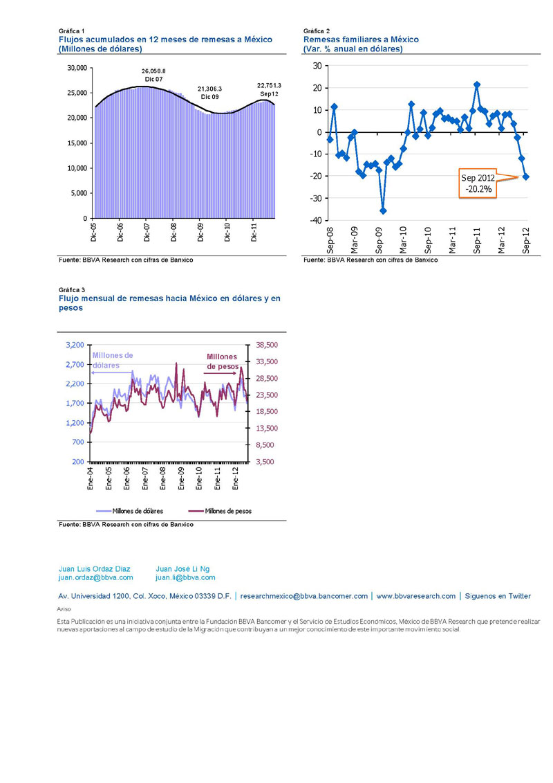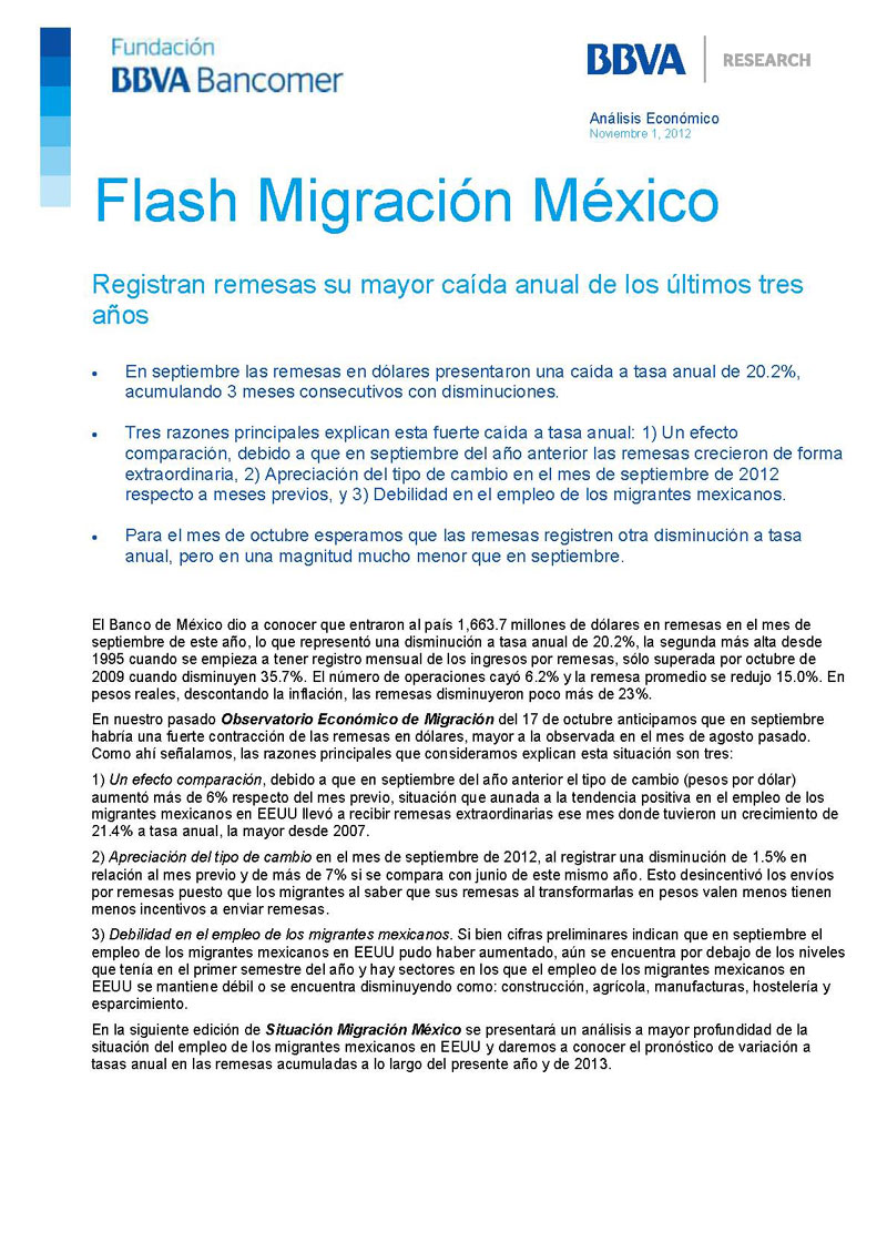 Share on Facebook Follow on Facebook Add to Google+ Connect on Linked in Subscribe by Email Print This Post Registran remesas su mayor caida anual de los ultimos tres años. En Septiembre las remesas en dolares presentaron una caida a tasa anual de 20.2% acumulando 3 meses consecutivos. Share this: Share on Facebook (Opens in new window) Facebook Share on Threads (Opens in new window) Threads Share on WhatsApp (Opens in new window) WhatsApp Like this:Like Loading... Related Flash Migracion Mexico added by Brambila on November 1, 2012 View all posts by Brambila →